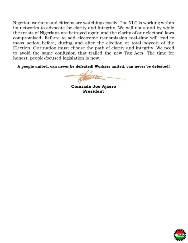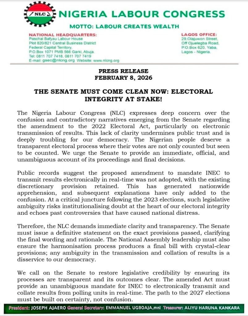 THE SENATE MUST COME CLEAN NOW : ELECTORAL INTEGRITY AT STAKE — NLC 08 Feb 2026 NOCK-Admin Uncategorized No comment