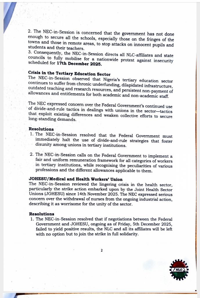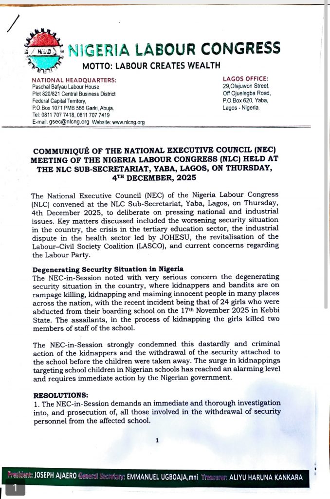 COMMUNIQUE OF NATIONAL EXECUTIVE COUNCIL (NEC ) MEETING OF THE NIGERIA LABOUR CONGRESS (NLC) AT NLC SUB- SECRETARIAT, YABA, LAGOS STATE. THURSDAY 4TH DECEMBER 2025