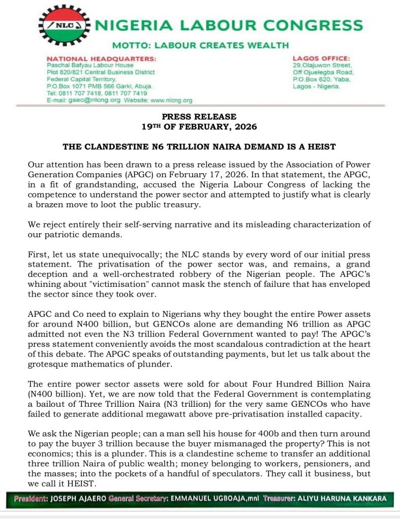 THE CLANDESTINE N6 TRILLION NAIRA DEMAND IS A HEIST —NLC 19 Feb 2026 NOCK-Admin Uncategorized No comment